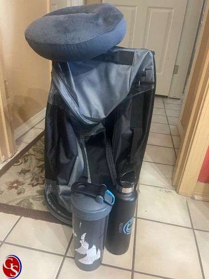 (2) DRINKING CONTAINERS, (1) TRAVEL PILLOW, ROLL A ROUND BAG