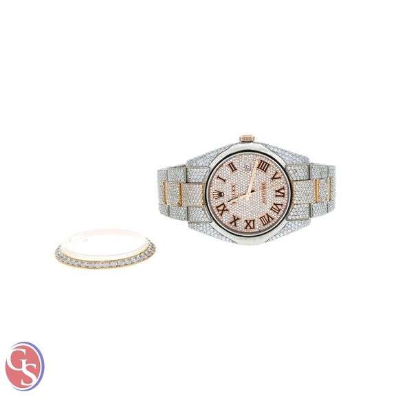 WATCH: [1] 18kt rose gold and stainless steel DateJust automatic watch; Aftermarket pave diamond dial with Roman Numeral hour markers; 18kt aftermarket diamond bezel set with (40) round brilliant cut diamonds, apprx. 2.6mm, estimated 2.70 cttw., G/H, VS2-SI1; 41mm case (NOTE: Bezel and crystal is loose and needs to be reinstalled); 18kt and stainless steel Oyster bracelet (6HM 72611 - Clasp is missing foldover portion and pin is loose); Case and bracelet set with aftermarket round brilliant cut diamonds estimated 13.50 cttw., G/H, SI Clarity; Model 126301, S/N 43K812U9; Mvmt 3235, Mvmt S/N 5V417584. Watch running at the time of examination (1/21) but not assessed for duration or time keeping accuracy. View Lot Video
