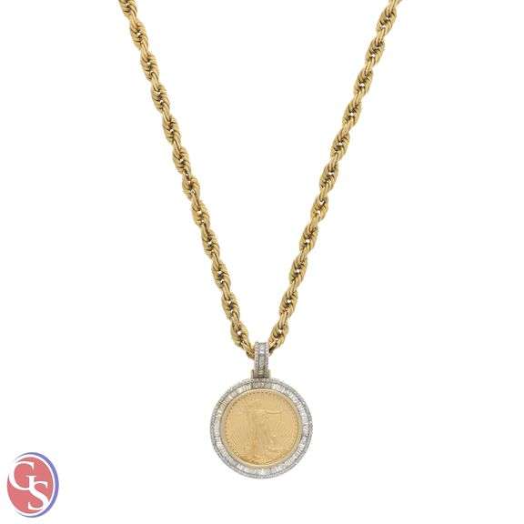 NECKLACE & PENDANT: [1] 10kt yellow gold rope chain necklace, 4.60mm wide x 24.25" long with lobster style clasp, 37.0 grams; [1] 10kt yellow gold diamond coin pendant set with (1) 2012 $10 Gold American Eagle coin - .9167 fine 1/4 troy ounce fine gold and (118) round single cut diamonds and (85) tapered baguette diamonds, estimated 1.20 cttw., I/J, SI-I Clarity, 1.5" tall, 12.6 grams