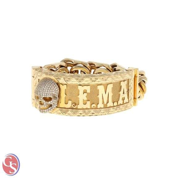 BRACELET: [1] 10k yellow gold (stamped) and cubic zirconia ID bracelet. 9 inches long and 32mm wide. "LEMA" on front with round CZ covered skull. 245.8 grams.